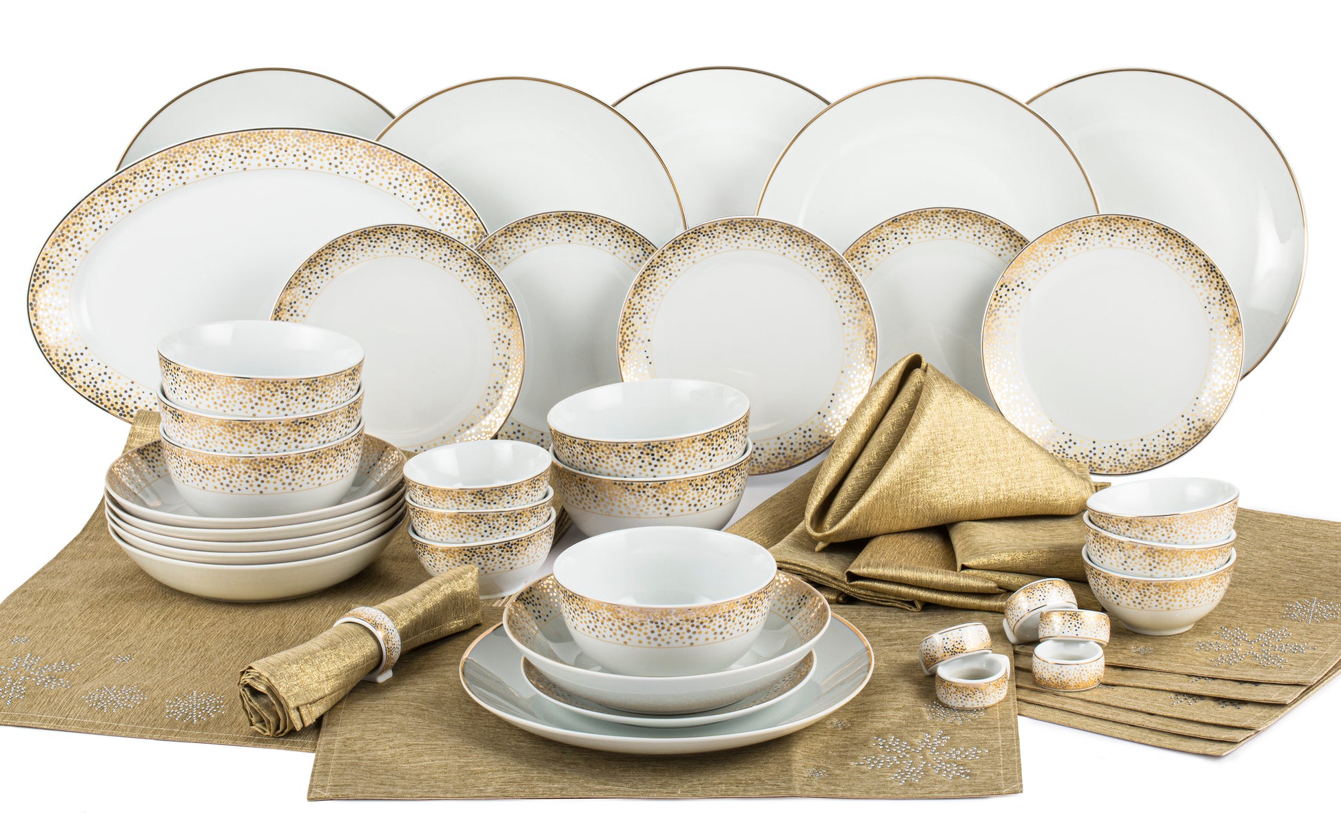 Experience timeless elegance with the 50-piece Gold Sparkle Tableware Set. Crafted from fine porcelain, each piece features gold spots that adds a touch of opulence to your dining table. Perfect for formal dinners, celebrations, and special occasions where style matters.